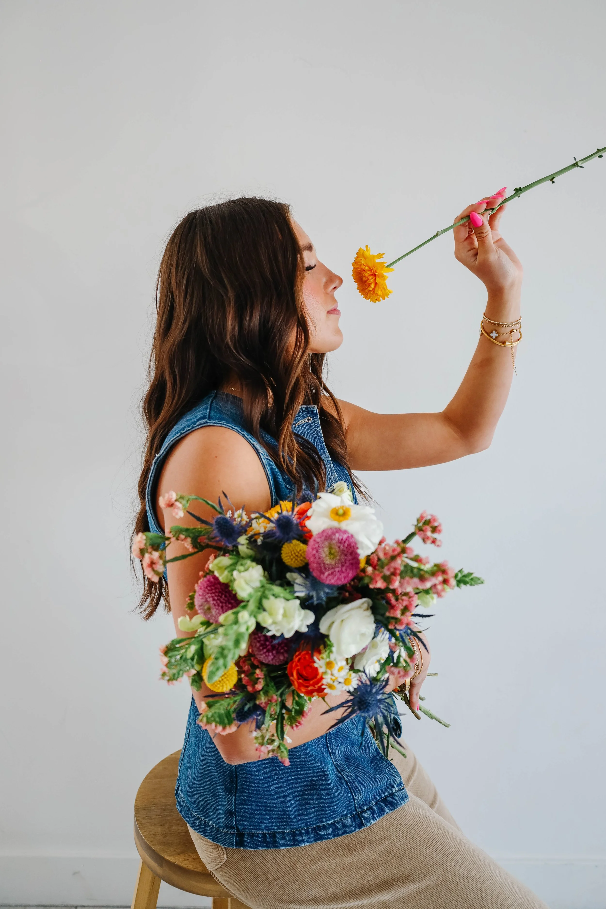 A woman with long, wavy brown hair, wearing a sleeveless denim shirt, holding a large colorful bouquet of flowers, and holding a yellow flower stem near her face in front of a plain white wall.