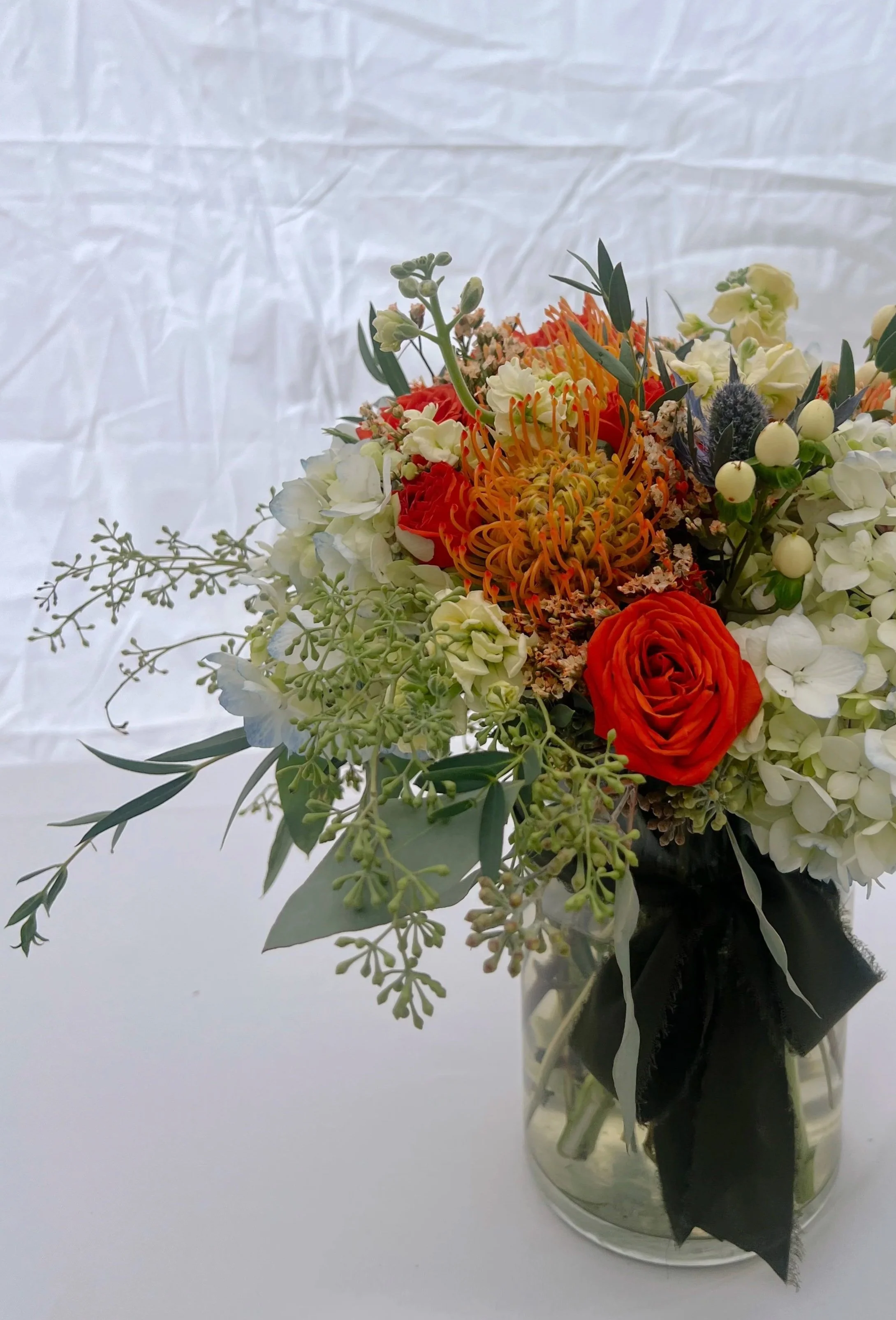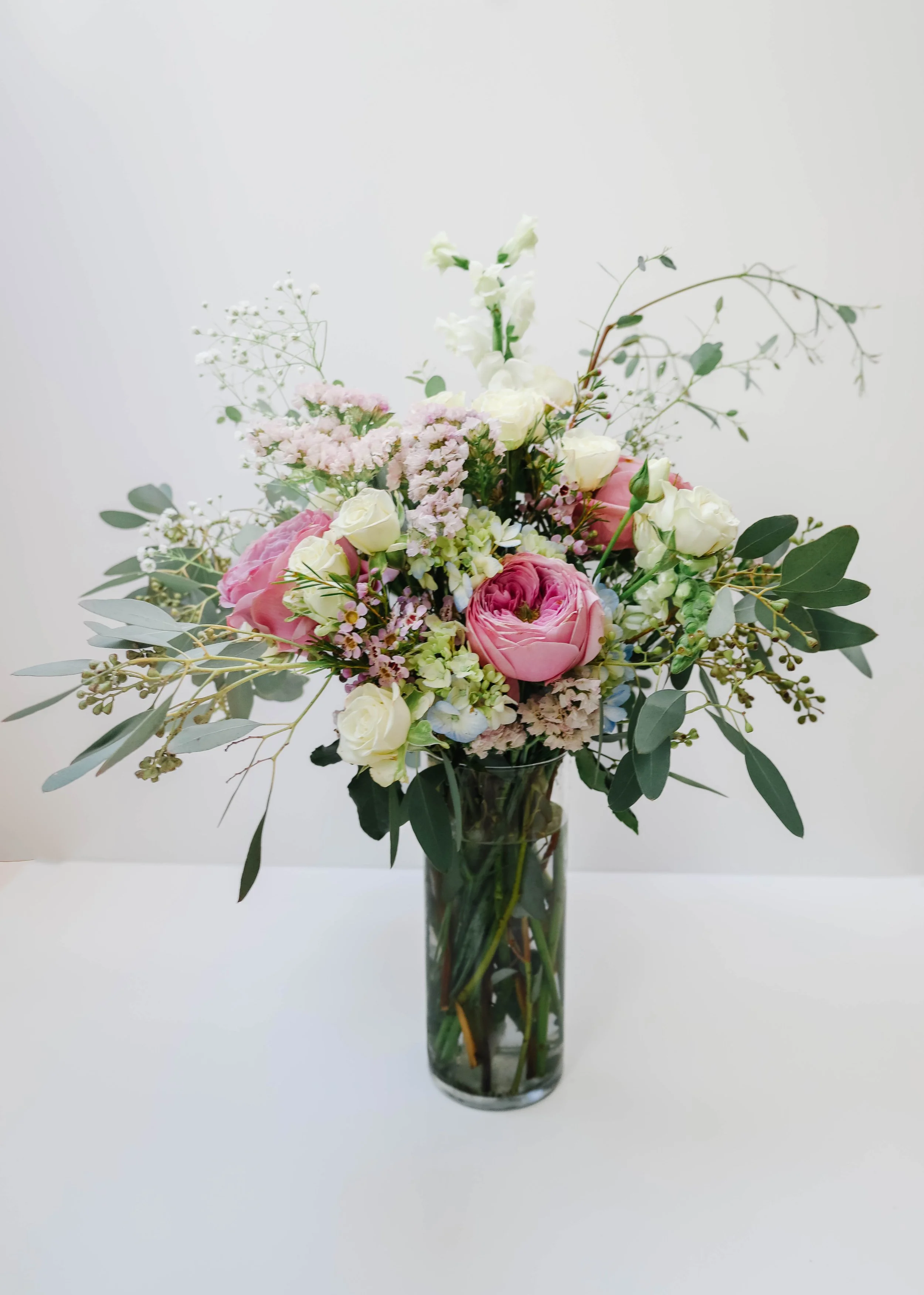 A floral bouquet with pink tulips, white dahlias, light peach carnations, yellow billy balls, blue thistles, and greenery in a glass vase.